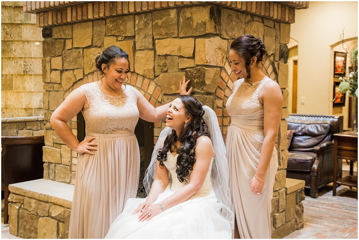 By the time Tim and Ashleigh were ready for their first look it had snowed and cleared at least 3-4 different times. Due to the ever evolving weather of snow/sun/snow again their outdoor first look was changed to this indoor impromptu fireplace location. It was still adorable even though we couldn’t do it outside! Following their first look we opted to take advantage of another great location on the Della Terra property and continue with some more formal photos. The timing was incredible and snow cleared just as it was time for Ashleigh to head down the isle. With this entrance she truly did get her fairytale wedding. She arrived at the bridge in her horse and carriage on her fathers arm. It was absolutely a show stopping moment!