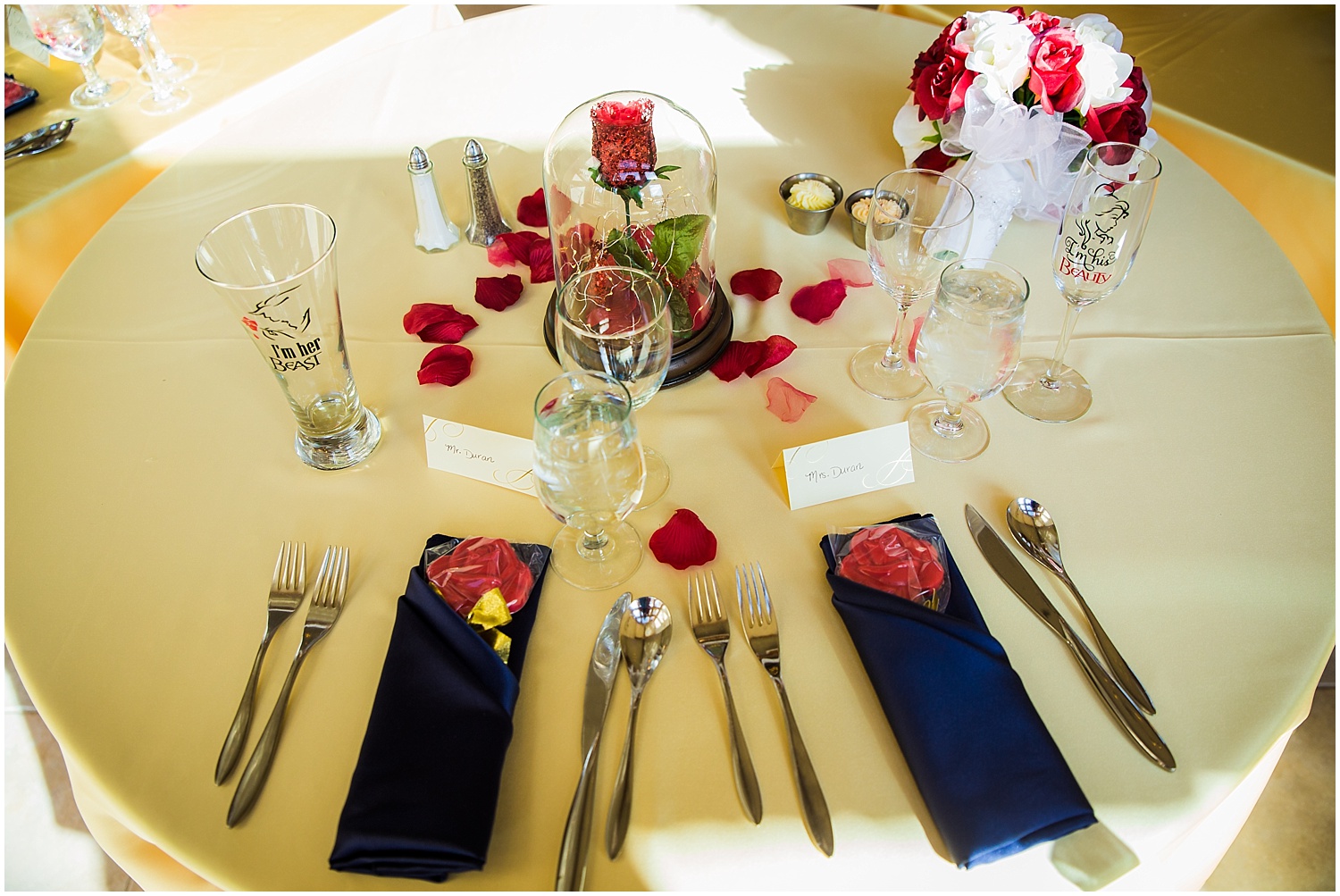 Tim and Ashleigh’s Della Terra Fairytale Wedding was gorgeous. They even themed their fairytale wedding with Beauty and the Beast Decor. Including the glass red rose. It was perfect!